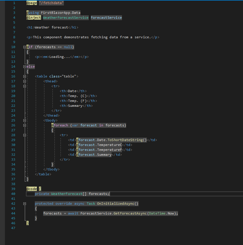 Fetch Data kısmındaki örneğe bakalım. Aşağıdaki WeatherForecast objesini GetForecastAsync metotu ile rastgele oluşturulduktan sonra önyüzde bu methodu kullanarak tablo oluşumu sağlanmıştır. Async metotu çağırırken javascript kullanmadan Dependency Injection ile birlikte çağırarak gelen datayı tabloya yazıyoruz.